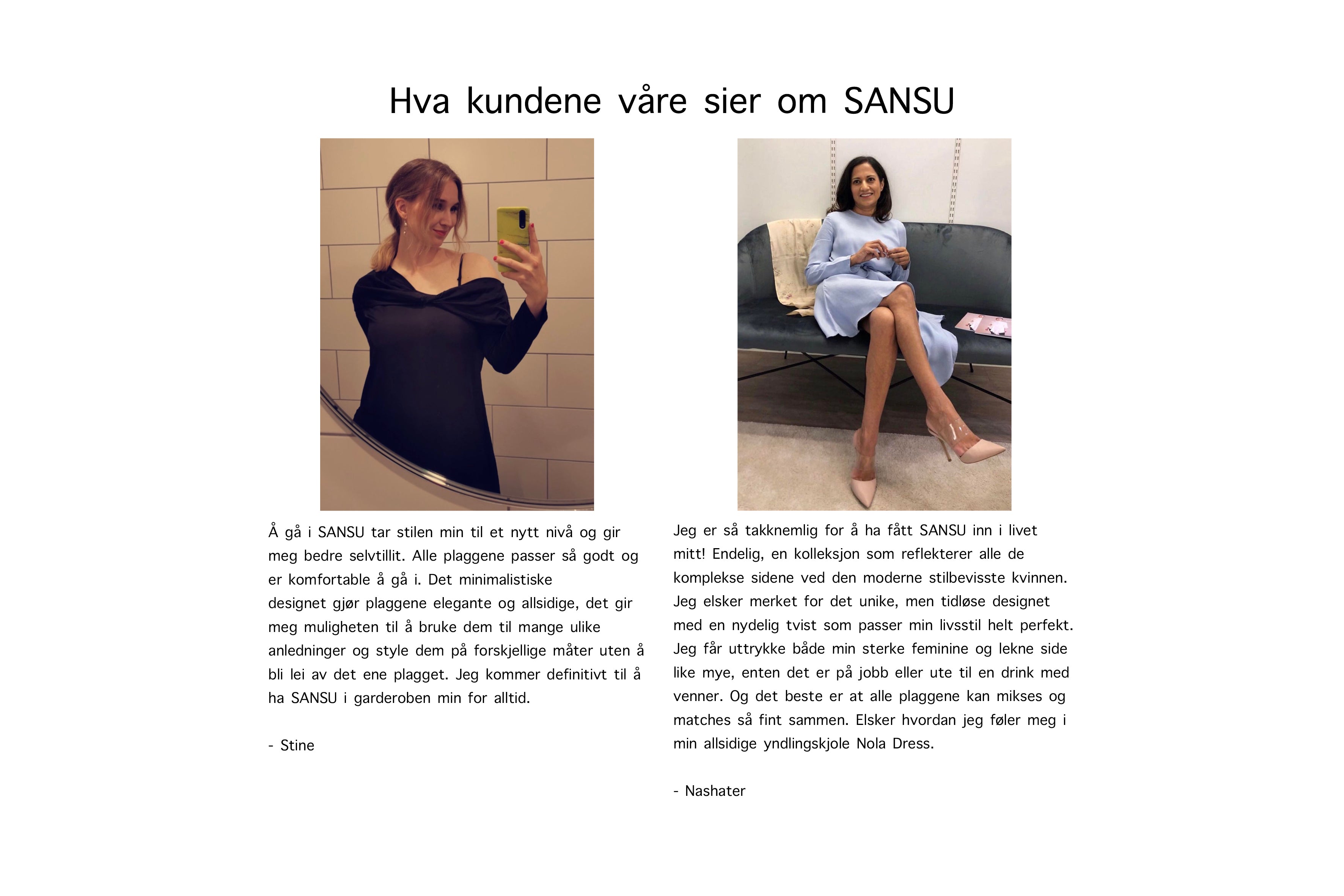 "Jeg designer alltid med kunden i tankene. Jeg vil at SANSU-kvinnen skal føle at hun trygt kan kle seg vakkert, vel vitende om at bærekraft går som en rød tråd gjennom hele designprosessen og valg av materialer."