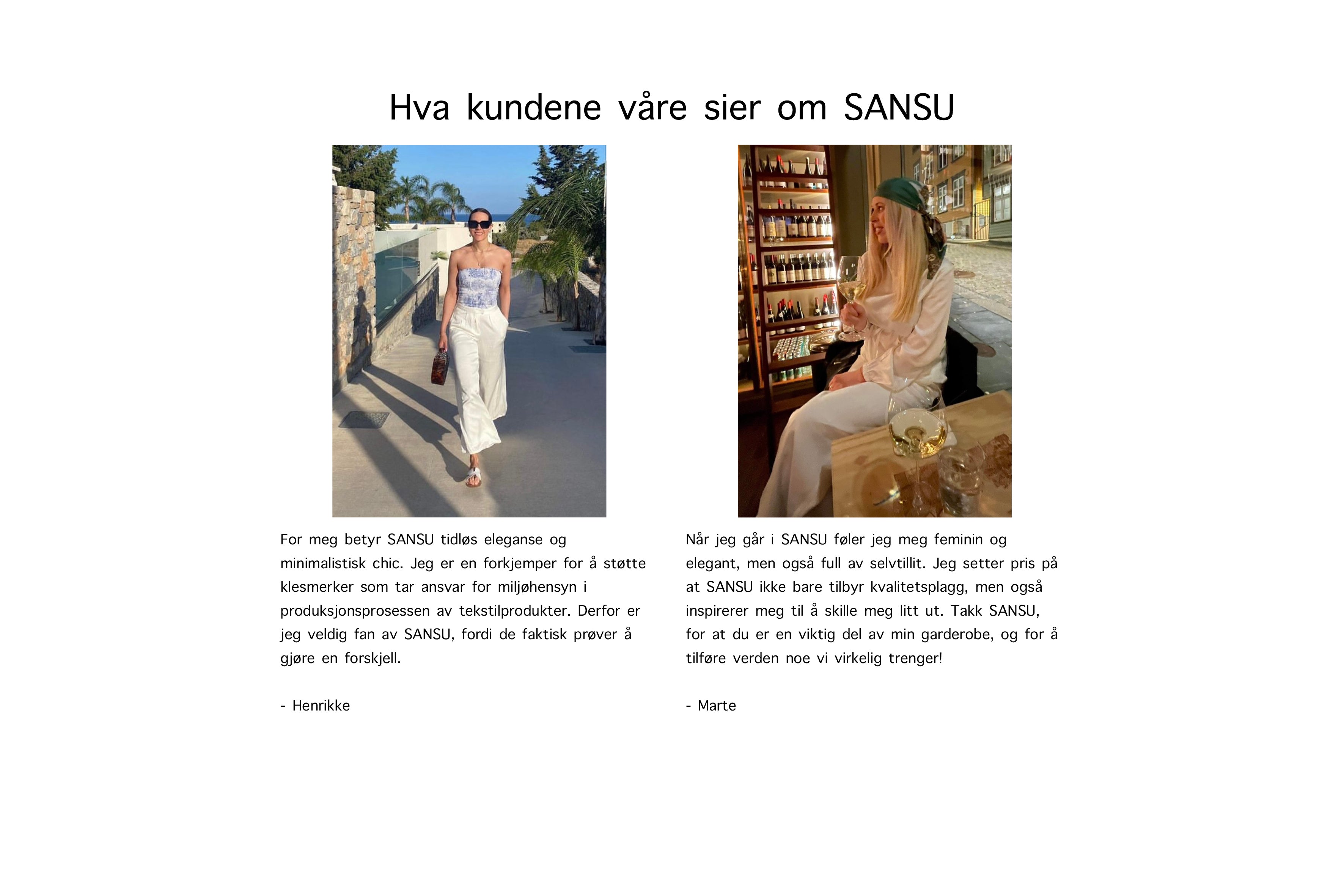 SANSU er et norsk klesmerke, etablert i Stavanger i 2019 av designer og grunnlegger Susanne Schanche Sandgren. Det visuelle uttrykket kjennetegnes av avslappet eleganse og feminin minimalisme, og merkets signaturdesign består av interessante snitt, draperingsteknikker, justerbare knytebelter, og et fokus på å bruke eksklusive materialer som er bærekraftig produsert, så langt det er mulig.