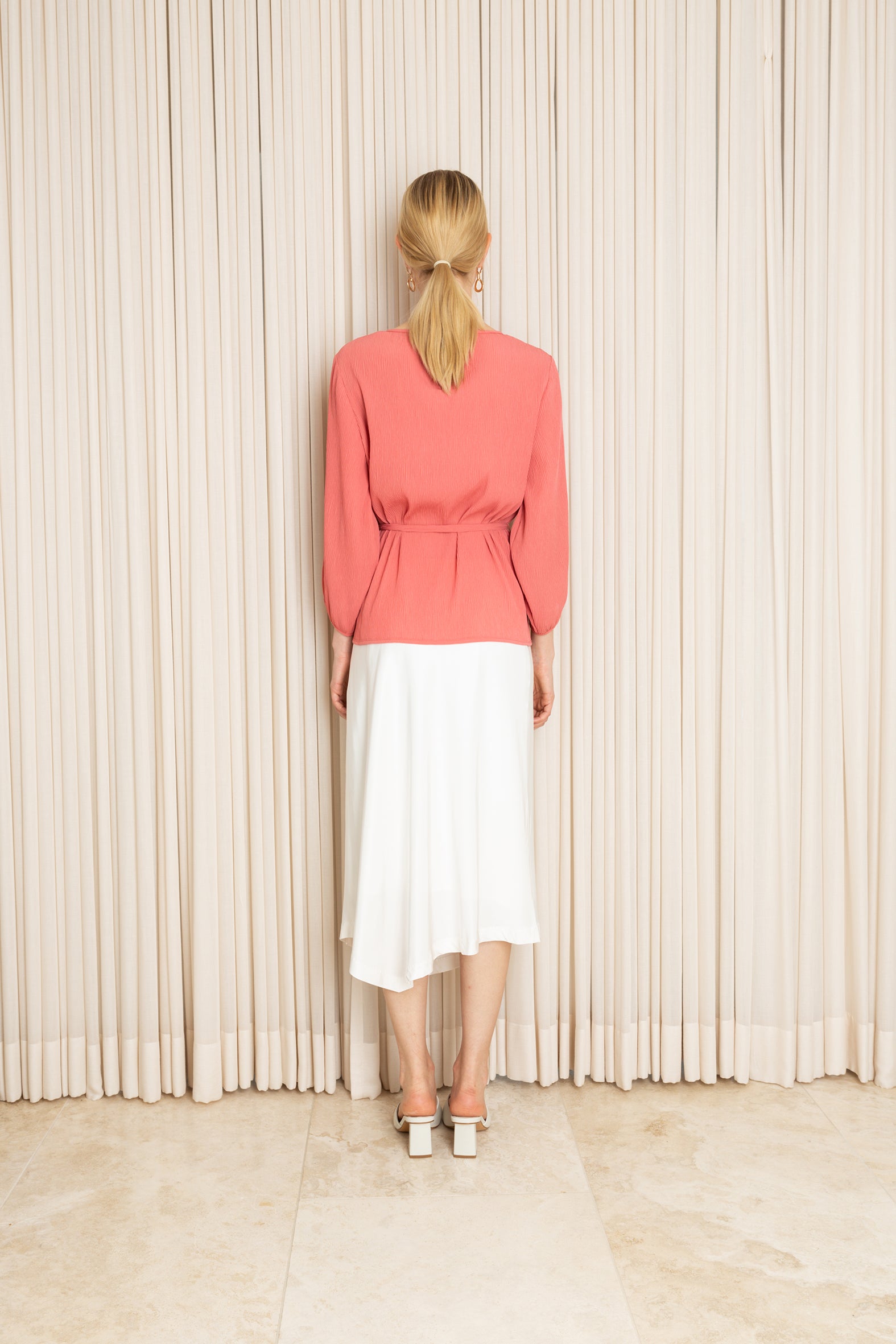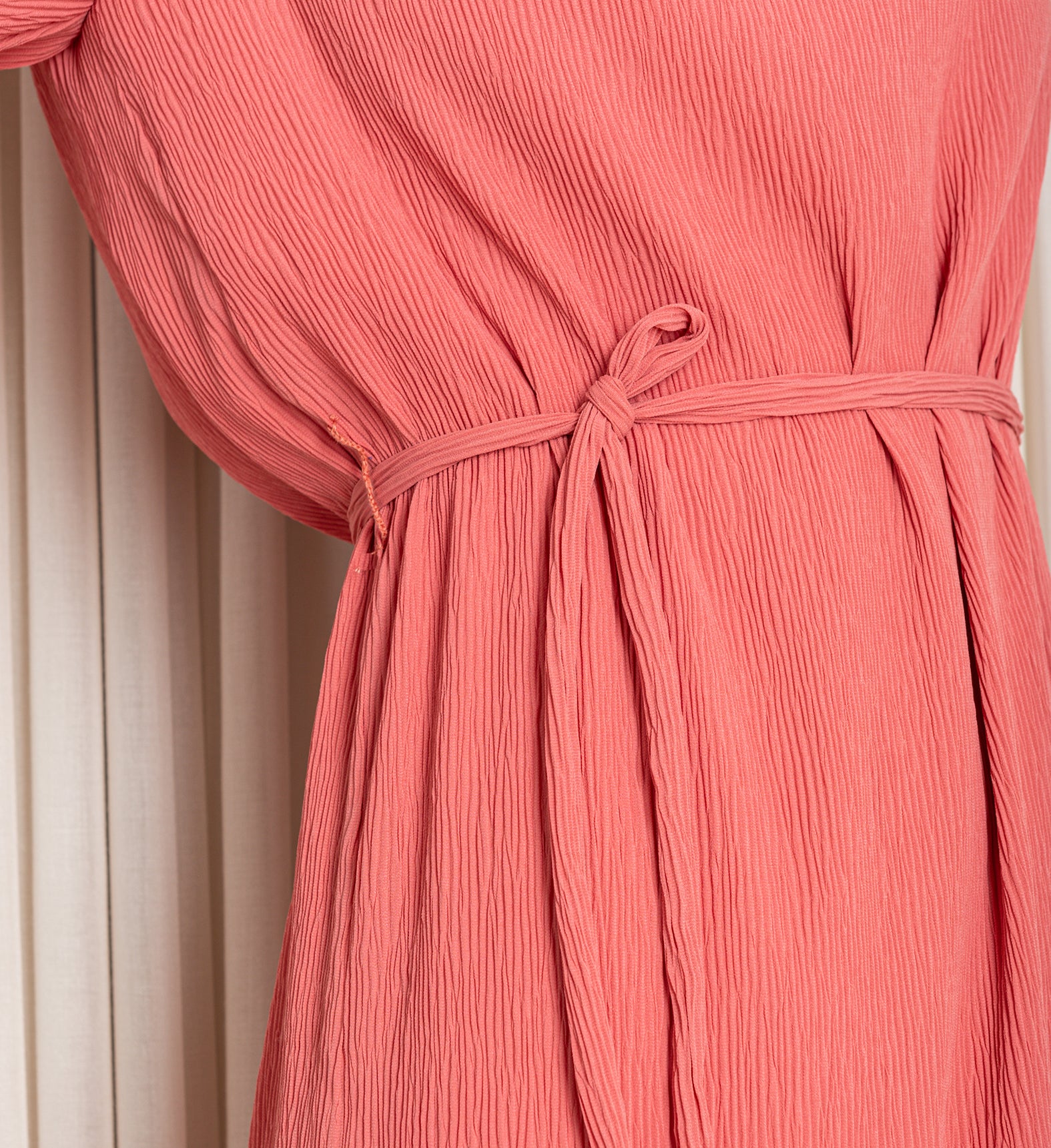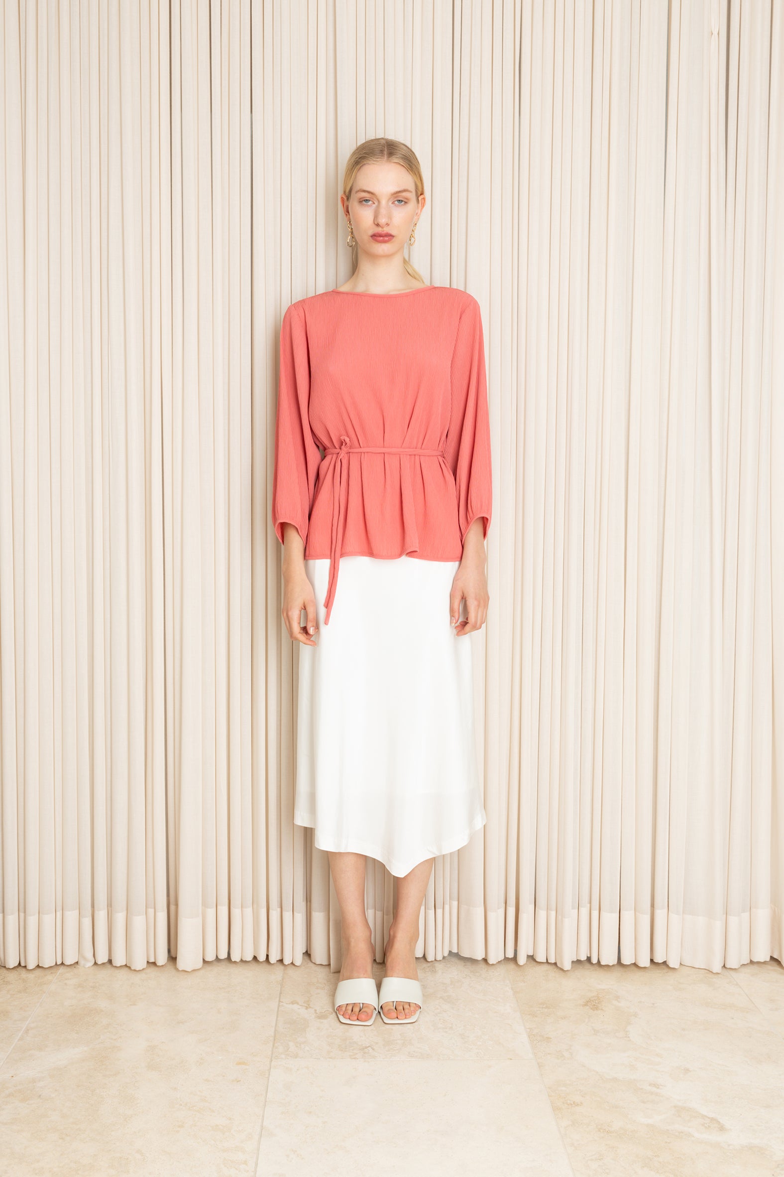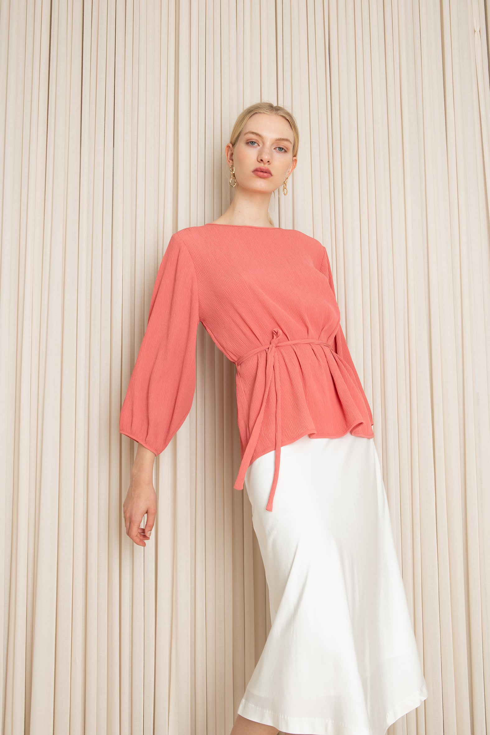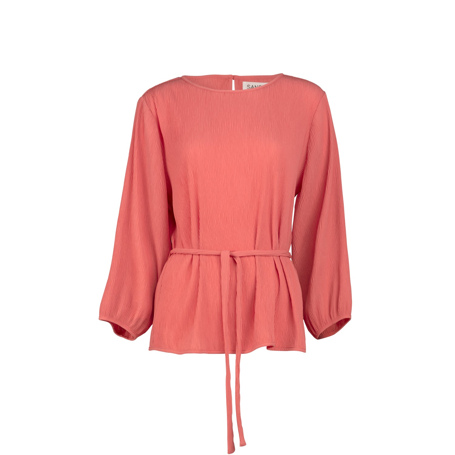 Bluse med med løs passform, 3/4-lange ballongermer, båthals og smalt knytebelte i midjen. Lukkes med knapp bak i nakken. Laget i et lett og luftig plissé-stoff.